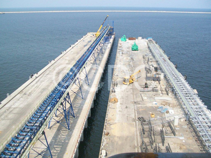 The project comprises of 120m long x 10m width approach, 350m long x 30m wide Main jetty and 62m long x 15m width RO-RO jetty | The responsibilities included preparation of design calculation and drawings of 120m long approach for vehicular traffic and conveyor trestles on RCC deck with precast beams supported on 1100 mm dia cast-in-situ piles,350m long main jetty designed to accommodate 250000 DWT vessels, Drive House and Take up Tower with conveyor trestles on RCC deck precast beam system rested and supported on 1300 dia cast-in-situ piles and 62m long RO-RO jetty for 17200 DWT RO-RO vessels with RCC deck with precast beam system supported on 1200mm dia cast-in-situ piles. |